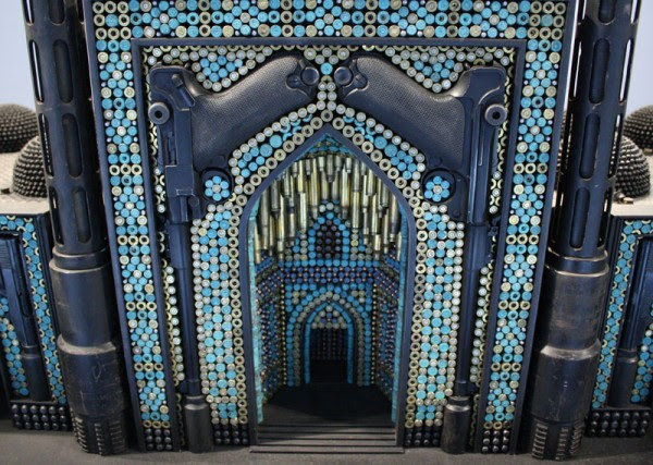 Sadly, religion and wars are often inevitably linked together. This doomed and notorious relationship inspired the American artist Al Farrow for his project Reliquaries, a series of model churches, temples and mosques and other religious instituions made from killer weapons and deadly bullets.